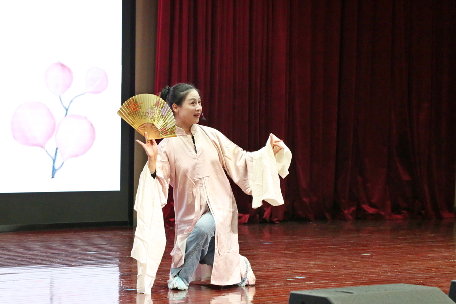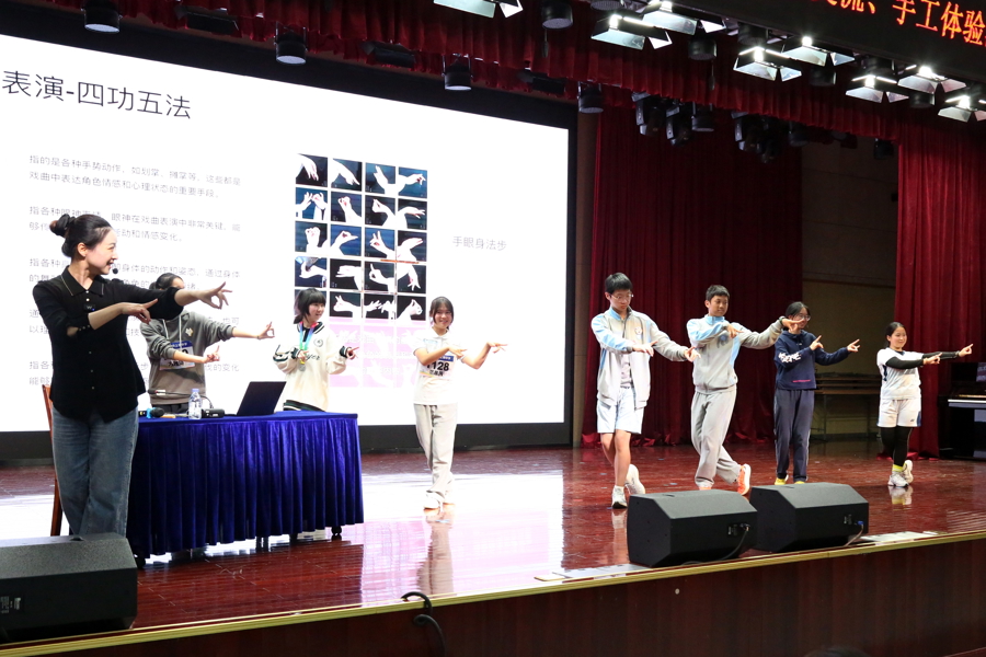 “传统戏曲通过一桌二椅进行虚拟式表演。”罗晨雪指着讲座的桌子对学生们说,“我今天靠着它,就是一个桌子。我一转身,桌子换了一个场景,可能不再是书房中的桌子,而是前厅的桌子,或者就不是桌子,而是一座山。”她还现场演示昆曲身段与念白,“念白非常重要,小时候我们对着墙练习念白。不同角色有各自不一样的念法。每个字的字头、字中和字尾都有非常严格要求。”