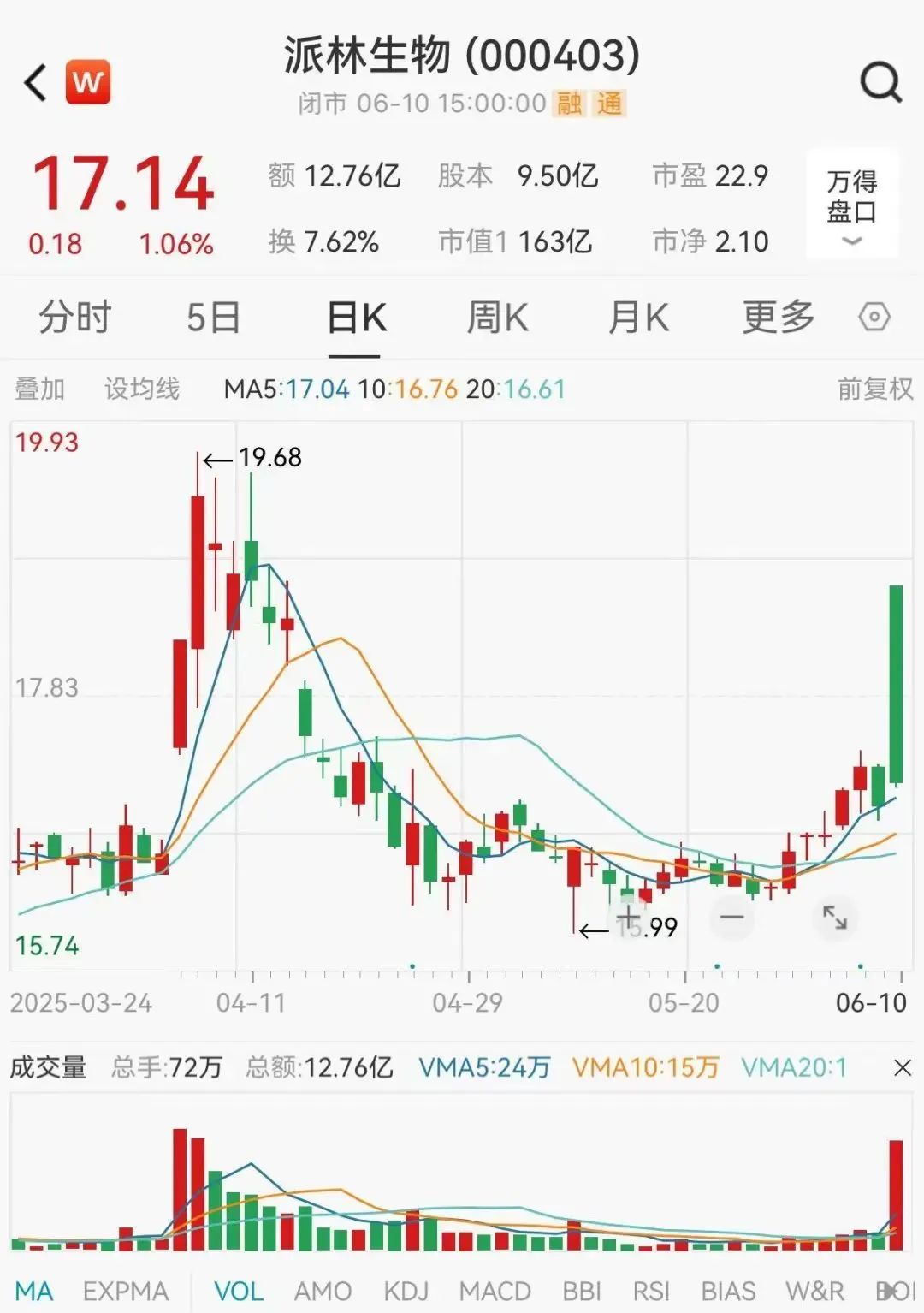 6月10日,派林生物股价高开低走,收出长阴线。