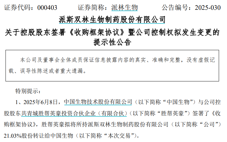 6月9日晚间,派林生物发布公告称,中国生物与公司控股股东胜帮英豪签署了《收购框架协议》,中国生物拟协议收购胜帮英豪持有的公司21.03%股份。