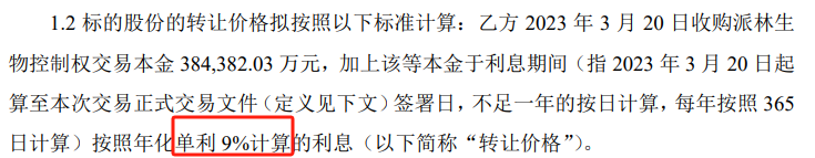 交易价格为胜帮英豪此前收购派林生物控制权的38.44亿元本金,加上该本金自2023年3月20日起至本次交易正式文件签署日按年化单利9%计算的利息,不足一年的按日计算,每年按照365日计算。